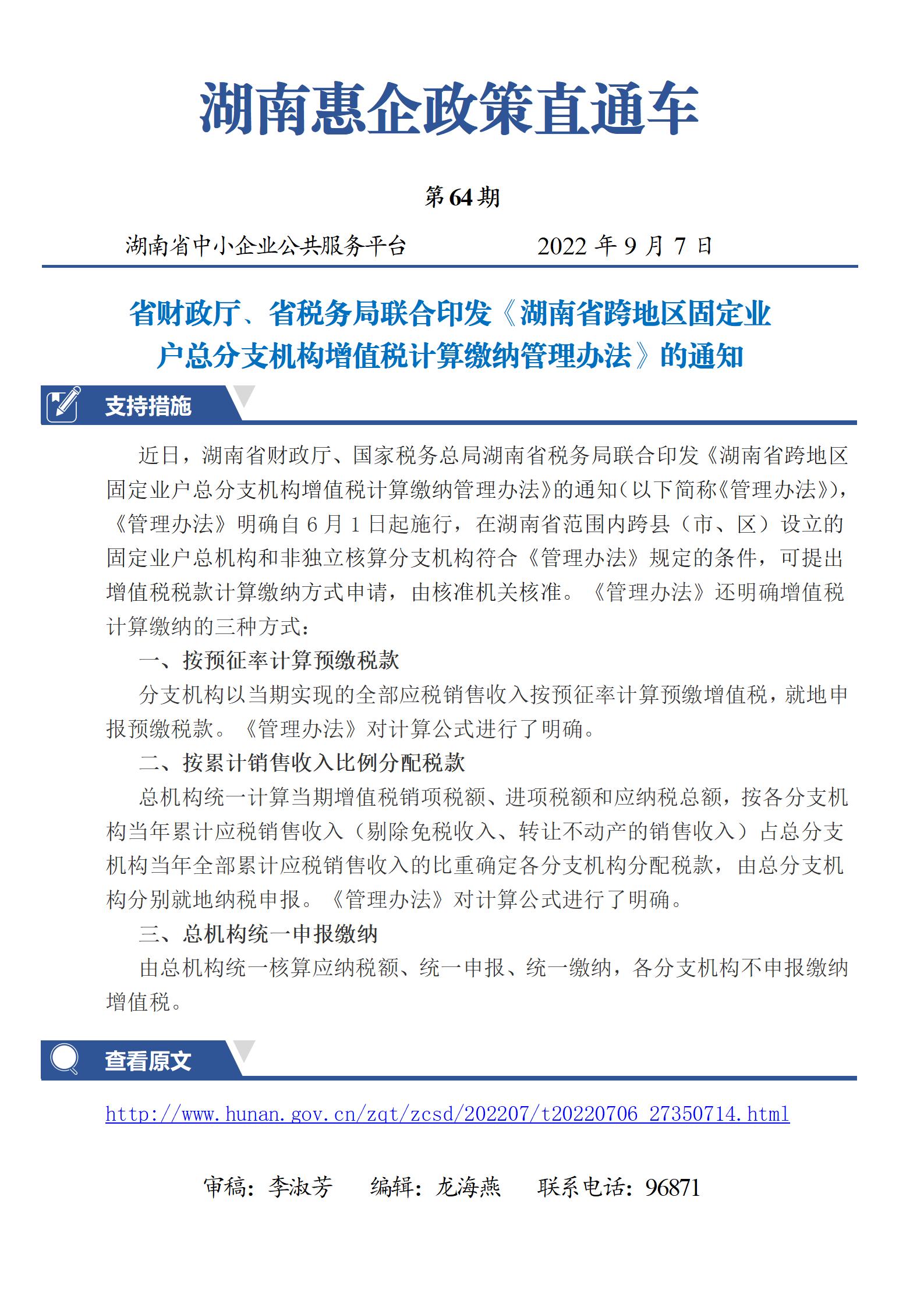 省財政廳、省稅務(wù)局聯(lián)合印發(fā)《湖南省跨地區(qū)固定業(yè)戶總分支機(jī)構(gòu)增值稅計算繳納管理辦法》的通知