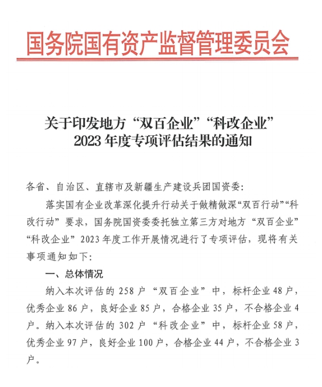 據(jù)了解,“科改企業(yè)”專項評估每年進行一次,旨在落實國有企業(yè)改革深化提升行動關于做精做深“科改行動”要求。本次國務院國資委委托獨立第三方對地方“科改企業(yè)”2023年度工作開展情況進行了專項評估,考核結(jié)果按照得分高低分為標桿、優(yōu)秀、良好、合格、不合格五個等級,考核內(nèi)容涉及企業(yè)科技創(chuàng)新、體制機制、綜合成效等方面共計47項指標,全面權威地反應了企業(yè)在加快科技新成果轉(zhuǎn)化、提升自主創(chuàng)新能力等方面的舉措和成果。