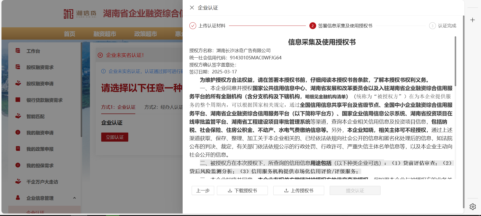 5、在完成企業(yè)認(rèn)證后,進(jìn)行企業(yè)信息采集使用授權(quán)書簽署上傳,允許平臺(tái)查詢企業(yè)相關(guān)基礎(chǔ)信息、納稅欠稅、不動(dòng)產(chǎn)、水電氣繳費(fèi)信息情況。