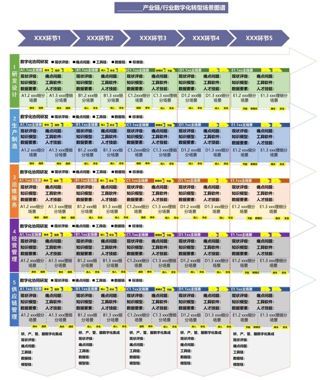 制造業(yè)企業(yè)數(shù)字化轉型典型場景參考聚焦產(chǎn)業(yè)鏈上下游企業(yè)研發(fā)設計、生產(chǎn)制造、運維服務、經(jīng)營管理、供應鏈管理等場景,以場景為切入點梳理數(shù)字化轉型痛點需求,繪制重點行業(yè)、重點產(chǎn)業(yè)鏈數(shù)字化轉型場景圖譜(簡稱“一圖譜”),明確企業(yè)數(shù)字化轉型路徑,促進產(chǎn)業(yè)鏈上下游企業(yè)協(xié)同開展轉型升級。分場景梳理數(shù)據(jù)要素、知識模型、工具軟件、人才技能等數(shù)字化轉型要素清單(簡稱“四清單”,合稱“一圖四清單”),助力政產(chǎn)學研各界聯(lián)合攻堅場景數(shù)字化轉型關鍵難點。