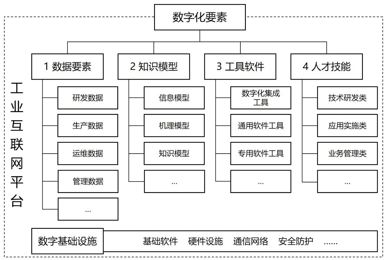 場景的數(shù)字化轉型需要相配套的數(shù)字化要素支撐。圍繞場景轉型所需的“人、機、料、法、環(huán)”等資源,將場景數(shù)字化要素劃分為數(shù)據(jù)要素、知識模型、工具軟件、人才技能等4類要素以及數(shù)字基礎設施保障(如圖2所示)。