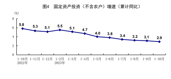 1-10月份,全國(guó)固定資產(chǎn)投資(不含農(nóng)戶)419409億元,同比增長(zhǎng)2.9%,比1-9月份回落0.2個(gè)百分點(diǎn)。分領(lǐng)域看,基礎(chǔ)設(shè)施投資同比增長(zhǎng)5.9%,制造業(yè)投資增長(zhǎng)6.2%,房地產(chǎn)開發(fā)投資下降9.3%。全國(guó)商品房銷售面積92579萬平方米,同比下降7.8%;商品房銷售額97161億元,下降4.9%。分產(chǎn)業(yè)看,第一產(chǎn)業(yè)投資同比下降1.3%,第二產(chǎn)業(yè)投資增長(zhǎng)9.0%,第三產(chǎn)業(yè)投資增長(zhǎng)0.4%。民間投資下降0.5%,降幅比1-9月份收窄0.1個(gè)百分點(diǎn);扣除房地產(chǎn)開發(fā)投資,民間投資同比增長(zhǎng)9.1%。高技術(shù)產(chǎn)業(yè)投資同比增長(zhǎng)11.1%,其中高技術(shù)制造業(yè)和高技術(shù)服務(wù)業(yè)投資分別增長(zhǎng)11.3%、10.5%。高技術(shù)制造業(yè)中,航空、航天器及設(shè)備制造業(yè),醫(yī)療儀器設(shè)備及儀器儀表制造業(yè)投資分別增長(zhǎng)19.0%、16.7%;高技術(shù)服務(wù)業(yè)中,科技成果轉(zhuǎn)化服務(wù)業(yè)、專業(yè)技術(shù)服務(wù)業(yè)投資分別增長(zhǎng)37.3%、29.1%。10月份,固定資產(chǎn)投資(不含農(nóng)戶)環(huán)比增長(zhǎng)0.10%。